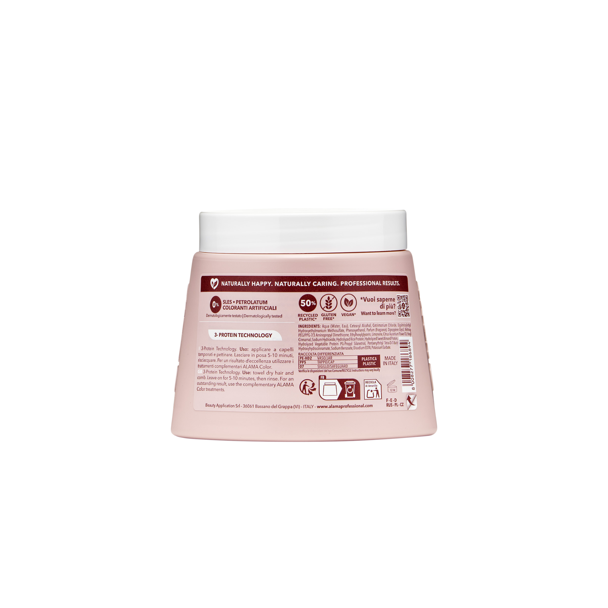 Maska za barvane lase, s tremi proteini. Vsebuje keratin, kolagen in elastin. Maska barvi daje sijaj, skrbi za mehkobo in teksturo las. Lasje so takoj po uporabi vedno lepši, bolj mehki in svilnati. Maska pomaga pri podaljšanju obstojnosti barve. Okolju prijazen izdelek.