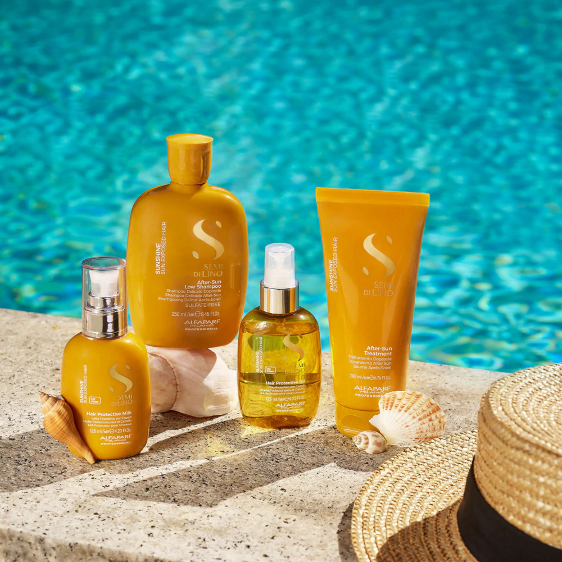 Zaradi škodljivega UV-sevanja lasje izgubijo sijaj in zdrav videz. Razgrajuje namreč osnovni gradnik lasnega vlakna – keratin, s čimer nepovratno poškoduje njegovo strukturo. Zaščitni pripravek Alfaparf Milano Semi di Lino Sunshine zagotavlja lasem oziroma tudi lasišču prav tako nego kot krema za sončenje koži in obrazu. Lase ovije s tankim filmom, ki deluje kot pregrada, skozi katero škodljivo sevanje lasnih vlaken ne doseže. Lase, izpostavljene soncu, pomaga ohranjati navlažene, polne vitalnosti in brez poškodb.